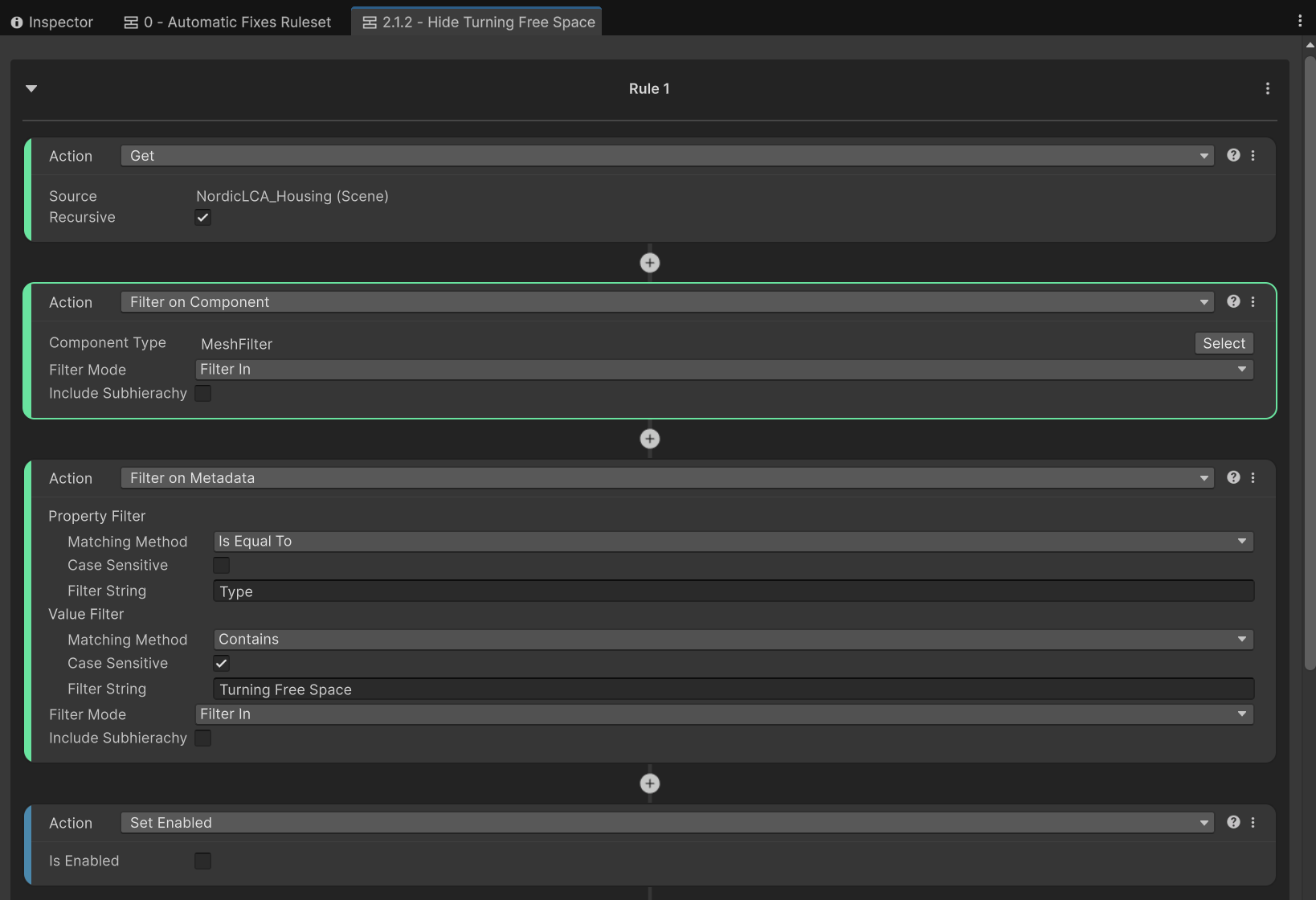 - Walkable Floors: The Set VIROO Floors Ruleset uses a Smart Metadata Filter to select all floor, stair, and toposolid elements and adds the necessary Unity components to define them as walkable areas.